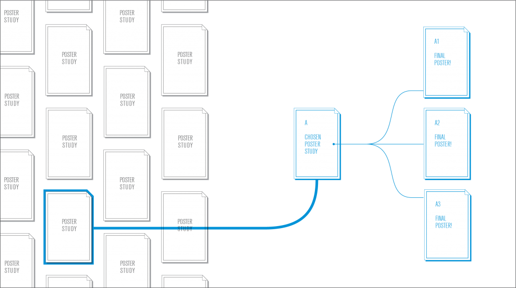 After making a number of studies – some complementary, some at odds with one another – we’ll have a chaotic mass of different ideas, different typographic ideas, and different pieces.